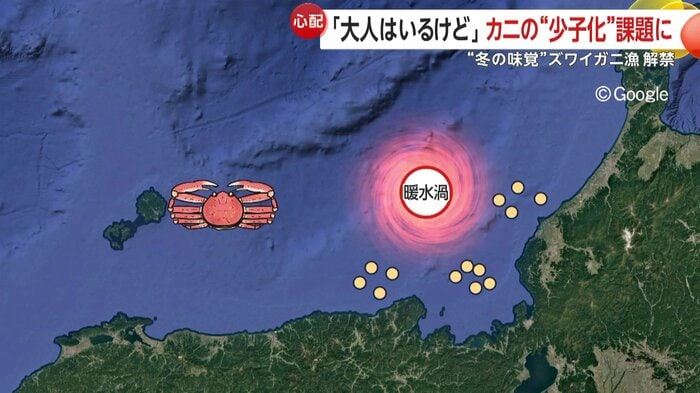 ズワイガニは、隠岐東沖周辺で産卵。ふ化したての赤ちゃんカニは海中を漂うが、「暖水渦」と呼ばれる海流の勢いが強くないと、生息に適した山陰の海域に戻れないのだという。