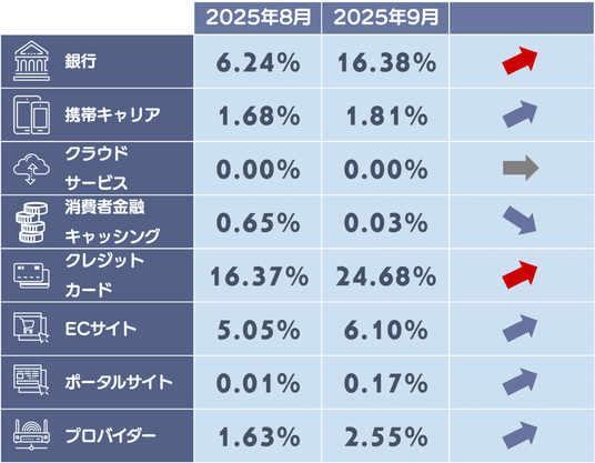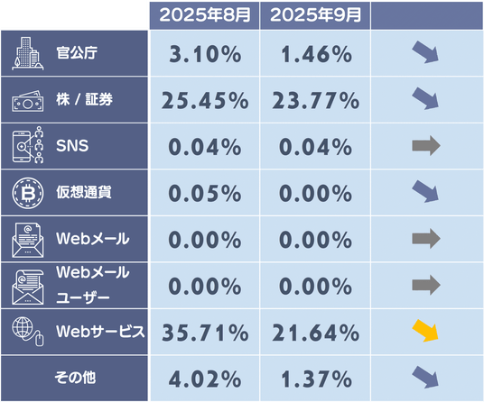 9月度は、証券分野でGMOクリック証券が突発的に台頭し、ランキング1位を占めました。一方これまで件数が多かった大和証券、野村証券、SBI証券の割合は減少に転じ、攻撃者がブランドを素早く「横滑り」させるローテーションを行う傾向が続いています。加えて、国勢調査、ハロウィンジャンボ、NHKプラス終了に絡めた、公的イベントや時流に乗った誘導も目立ちました。カテゴリ別では、GMOあおぞらネット銀行やJAバンクの増加により銀行系のフィッシングサイトが大きく増加し、また三井住友カードの増加でクレジットカード系も上昇しました。総じて「公式らしさ(権威性)×生活必須×時節性」を組み合わせ、心理的に信頼してしまいやすいターゲットが引き続き狙われています。