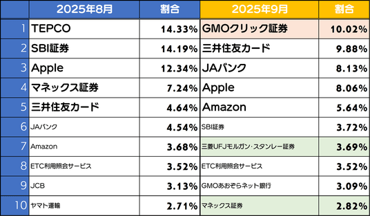 9月度はGMOクリック証券のフィッシングサイトが1位となっています。証券系全体のフィッシングサイト数は減少傾向にあるものの、三菱UFJ・モルガンスタンレー証券やマネックス証券など新しくランキングに入ったブランドも見られます。