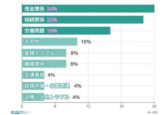 ・弁護士に相談した内容は「借金関係(約24%)」「相続関係(約22%)」「労働問題(約16%)」が上位