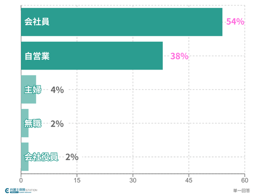 回答者の職業は「会社員」が約54%で最多。次いで「自営業」が約38%、「主婦」「無職」「会社役員」が各数%ずつとなった。