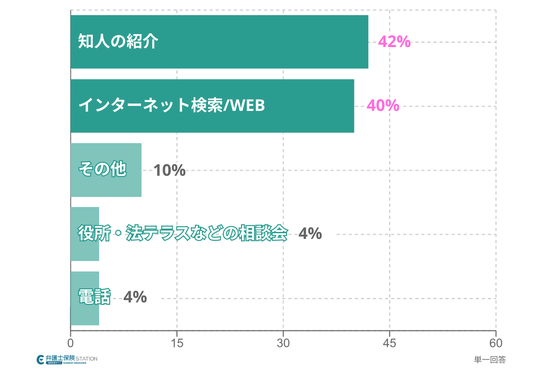 「知人の紹介」が約42%、「インターネット検索/WEB」が約40%で上位。「その他」「役所・法テラス」「電話」などが少数を占めた。