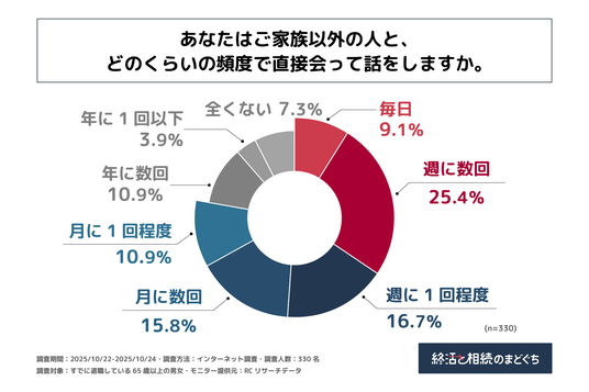 次に、「家族以外の人と、どのくらいの頻度で直接会って話をするか」を尋ねる設問への回答では、1位が「週に数回」で25.4%、2位が「週に1回程度」で16.7%、3位が「月に数回」で15.8%という結果になりました。また、1位の「週に数回」という回答と2位の「週に1回程度」という回答および「毎日(9.1%)」という回答を合計すると回答率51.2%となり、この結果から、すでに退職している65歳以上の男女で家族以外の人と「週1回以上」直接会って話をしている人の割合は約半数であることがわかりました。