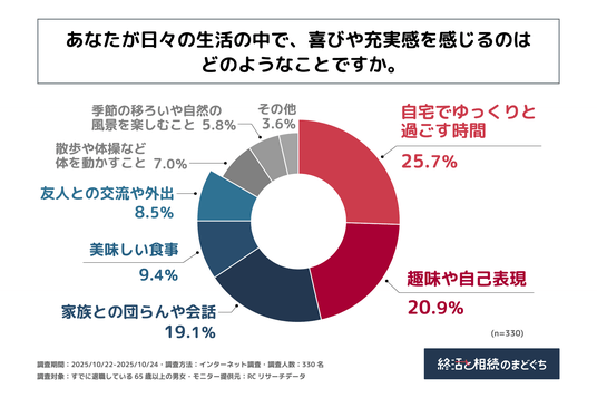 日々の生活の中で喜びや充実感を感じることのトップ3は、1位「自宅でゆっくりと過ごす時間」、2位「趣味や自己表現」、3位「家族との団らんや会話」