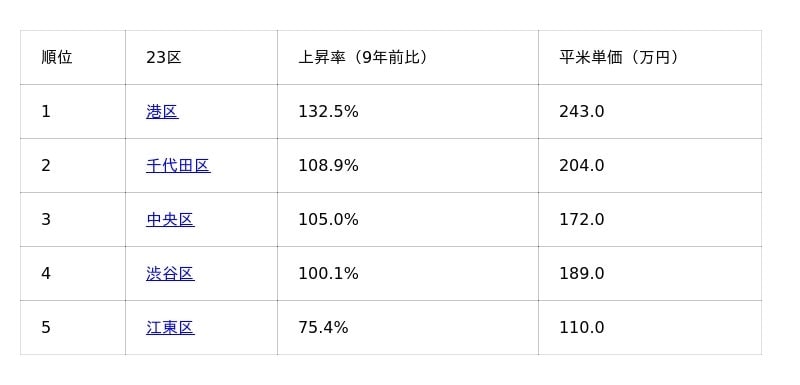 東京23区における9年前との上昇率をランキング形式で紹介します。9年間で各エリアがどのように変動してきたのかを可視化しました。価格の上昇率は売買を検討する際の重要な指標であり、マンションナビでは月次でデータを更新しています。