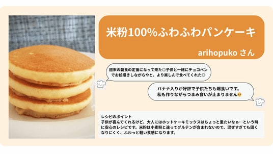 ・つくれぽ:「もちもち食感」「子どもが喜ぶ」「グルテンフリー」で支持。33.0%が「また作りたい」と記載(※1)