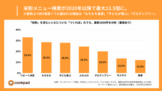 米粉レシピはクックパッドに4万件以上投稿されています(2025年11月時点)。つくれぽ分析では全体の33.0%が「リピ決定」「また作ります」と明言しており、一度使った人の満足度の高さがうかがえます。物価高に向き合いながらも、家族の好み、健康、安心感といった多面的な視点で食材を選ぶ時代に、米粉は"家族の満足を重視する選択"として定着しはじめています。食生活が変化する中で、米粉は新しい米の活用形態として注目されており、食料自給率の向上にも寄与することが期待されています。クックパッドは今後も生活者の料理行動から見える変化を発信し、「毎日の料理を楽しみにする」人を増やしてまいります。【クックパッドについて】