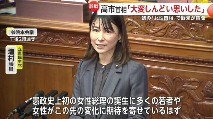 初の女性首相に期待感をにじませたのは、野党の立憲民主党・塩村文夏議員。