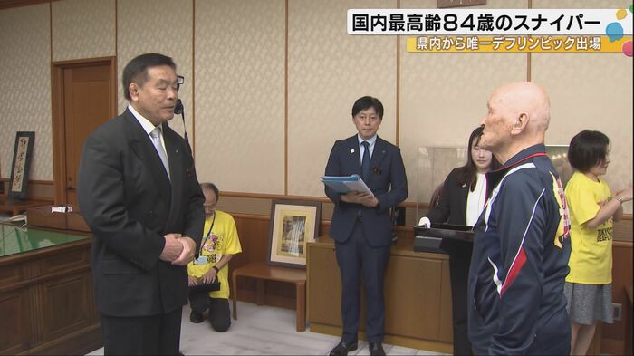 この日、知事室を訪れた高桑選手。知事に、「84歳ですが50年以上にわたってライフル射撃を行って参りました。それを糧に優勝目指して頑張ります」と決意を語った。
