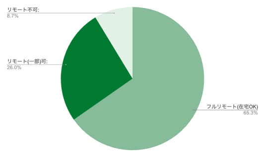 フルリモート案件が65.3%と圧倒的で、リモート一部可を合わせると91.3%がリモート対応可能です。デザインツールのクラウド化が進み、オンラインでのやり取りだけで完結するプロジェクトが増えたことが背景にあります。場所にとらわれず全国どこからでも案件に参画でき、地方在住のデザイナーや育児・介護と両立したい人にとって働きやすい環境が整っています。リモート不可は8.7%と少なく、柔軟な働き方を実現しやすい職種です。