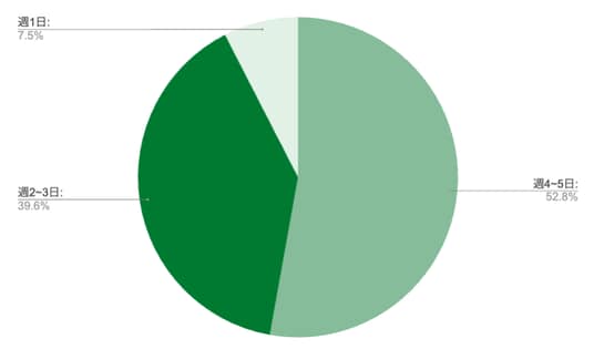 週4~5日が52.8%と過半数を占める一方で、週2~3日も39.6%と高い割合です。フルタイムでがっつり稼ぎたい人から、複数のプロジェクトを掛け持ちしたい人まで、多様な働き方が選べる職種といえます。デザイン業務はプロジェクト単位で完結しやすく、リモート対応も可能なため、柔軟な稼働調整がしやすいのが特徴です。週1日案件も7.5%あり、副業として始めやすい環境も整っていると言えるでしょう。