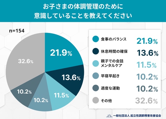 - 体調管理では「食事のバランス(21.9%)」が最多だが家庭により方針は様々