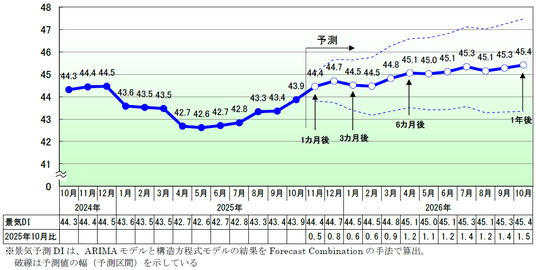 2025年10月の景気DIは43.9となり前月から0.5ポイント増加した。2020年10月以来5年ぶりに5カ月連続で改善。国内景気は、新政権への期待などを受けた株高を追い風に、幅広い業種で景況感が持ち直す動きが続いた。