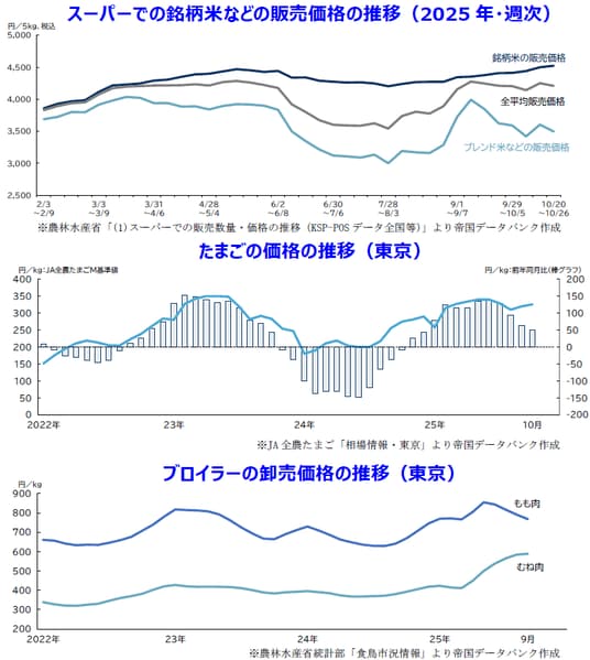 - 2025年における農畜産物の価格は、米の小売価格ほか、鶏卵や食肉などで高止まり傾向がみられる