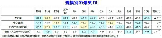「中小企業」「小規模企業」のどちらも改善し、2025年で最高水準となった。設備投資の再開にともない、『建設』や『製造』が上向き、景況感を押し上げる要因となった。一方で、「大企業」は悪化し、中小企業との規模間格差はやや縮小した。「大企業」(48.0)…前月比0.2ポイント減。6カ月ぶりに悪化。『不動産』はDIが50台後半と高水準ながらも、「価格に落ち着き感が出てきた」などのコメントが寄せられ、景況感の押し下げ要因となった。『サービス』も2カ月ぶりに悪化した。