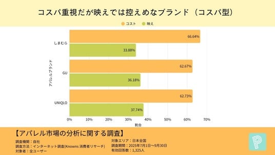 しまむら(コスパ66.64%/映え33.88%)、GU(62.67%/36.18%)、UNIQLO(62.73%/37.74%)が、「コスパが良い」と感じる割合が平均を大きく上回る一方、「映え」評価は控えめという結果に。