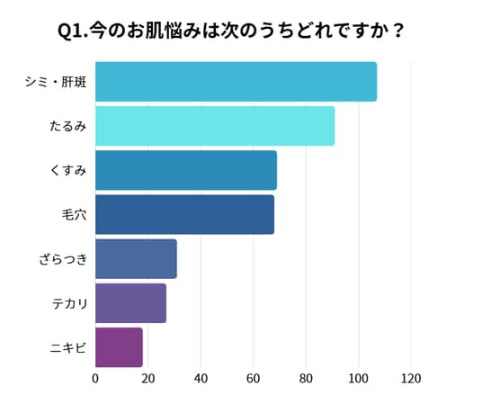 30代以上の女性を対象に、今のお肌悩みを複数回答で調査したところ「シミ・肝斑」が1位、「たるみ」が2位、「くすみ」が3位と言う結果に。