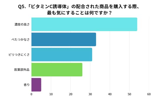 さらに、その「ビタミンC誘導体」配合の商品を購入するときに気を付けることは、1位「濃度の高さ」2位「べたつかなさ」3位「ピリつきにくさ」の順で回答が多くなりました。効果実感のために、高濃度のものを選ぶだけでなく、日々使用するものだからこそ使いやすい商品が求められていることが分かりました。