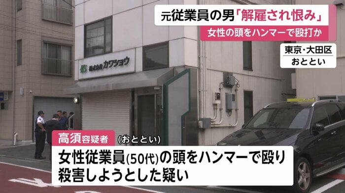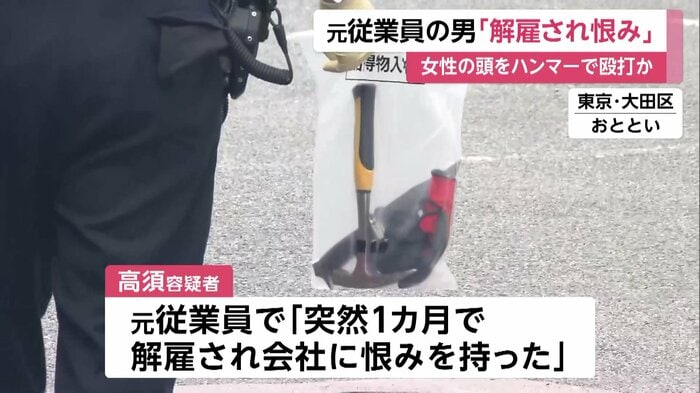 都内の会社で女性従業員が元従業員の男にハンマーで殴られた事件で、男が「1カ月で解雇され恨みを持った」と供述していることがわかった。