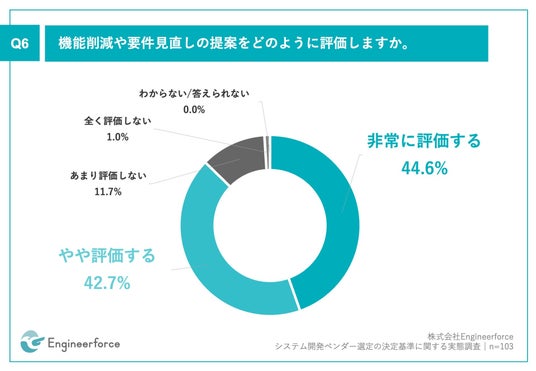 Q5で「積極的に提案された」「必要に応じて提案された」と回答した方に、「Q6.機能削減や要件見直しの提案をどのように評価しますか。」(n=103)と質問したところ、「非常に評価する」が44.6%、「やや評価する」が42.7%という回答となりました。
