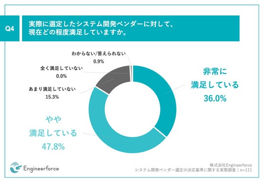 「Q4.実際に選定したシステム開発ベンダーに対して、現在どの程度満足していますか。」(n=111)と質問したところ、「非常に満足している」が36.0%、「やや満足している」が47.8%という回答となりました。