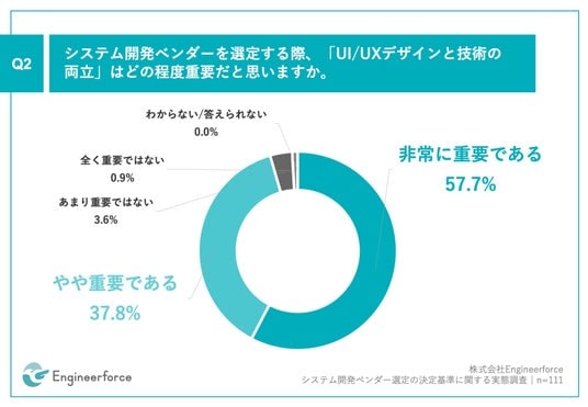 「Q2.システム開発ベンダーを選定する際、「UI/UXデザインと技術の両立」はどの程度重要だと思いますか。」(n=111)と質問したところ、「非常に重要である」が57.7%、「やや重要である」が37.8%という回答となりました。