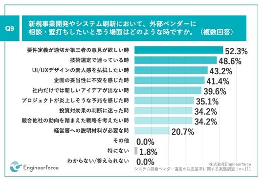 「Q9.新規事業開発やシステム刷新において、外部ベンダーに相談・壁打ちしたいと思う場面はどのような時ですか。(複数回答)」(n=111)と質問したところ、「要件定義が適切か第三者の意見が欲しい時」が52.3%、「技術選定で迷っている時」が48.6%、「UI/UXデザインの素人感を払拭したい時」が43.2%という回答となりました。