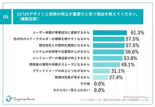 Q2で「非常に重要である」「やや重要である」と回答した方に、「Q3.UI/UXデザインと技術の両立が重要だと思う理由を教えてください。(複数回答)」(n=106)と質問したところ、「ユーザー体験が事業成功に直結するから」が61.3%、「社内外のステークホルダーの理解を得やすくなるから」が57.5%という回答となりました。