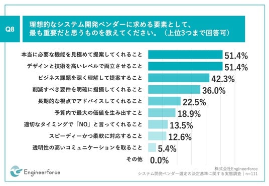 「Q8.理想的なシステム開発ベンダーに求める要素として、重要だと思うものを教えてください。(上位3つまで回答可)」(n=111)と質問したところ、「本当に必要な機能を見極めて提案してくれること」が51.4%、「デザインと技術を高いレベルで両立させること」が51.4%、「ビジネス課題を深く理解して提案すること」が42.3%という回答となりました。