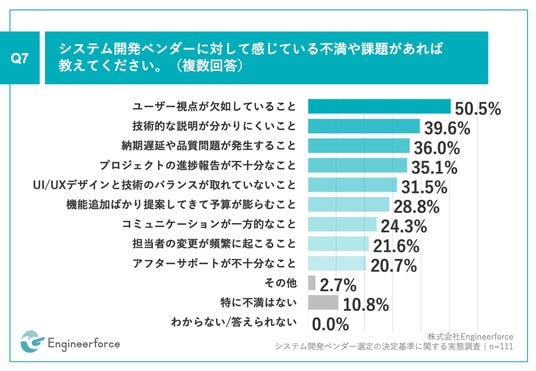 「Q7.システム開発ベンダーに対して感じている不満や課題があれば教えてください。(複数回答)」(n=111)と質問したところ、「ユーザー視点が欠如していること」が50.5%、「技術的な説明が分かりにくいこと」が39.6%、「納期遅延や品質問題が発生すること」が36.0%という回答となりました。