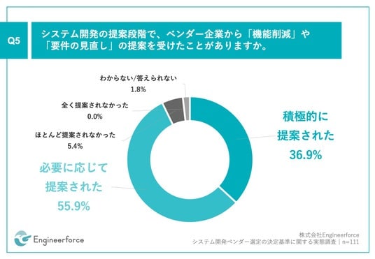 「Q5.システム開発の提案段階で、ベンダー企業から「機能削減」や「要件の見直し」の提案を受けたことがありますか。」(n=111)と質問したところ、「積極的に提案された」が36.9%、「必要に応じて提案された」が55.9%という回答となりました。