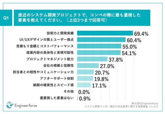 「Q1.直近のシステム開発プロジェクトで、コンペの際に最も重視した要素を教えてください。(上位3つまで回答可)」(n=111)と質問したところ、「技術力と開発実績」が69.4%、「UI/UXデザインの質とユーザー視点」が60.4%、「見積もり金額とコストパフォーマンス」が55.0%という回答となりました。