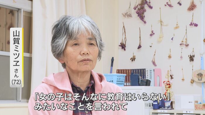 72歳の山賀ミツヱさん。中学2年生として通学している。勉強熱心な山賀さんがこの学校に通う理由は、55年近く前のことに遡る。