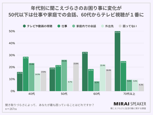 年代別に見ると、40代は「仕事」、50代は「家庭内での会話」、60代以上では「テレビや動画の視聴」が突出し70代では約半数が困っていると回答しました。一方、「外出先で困る」割合は60代が他の年代と比べて最も高くなっています。
