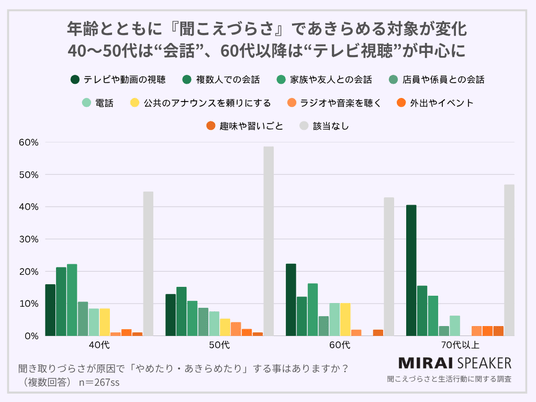 約半数の人が“聞こえづらさが原因で何かをあきらめた経験がある”と回答。「テレビ視聴」「複数人での会話」「家族や友人との会話」が上位を占めました。