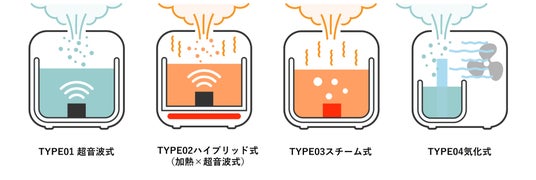 ■加湿方式の違いを図解で解説超音波式・ハイブリッド式(超音波式+加熱式)・スチーム式・気化式をそれぞれのメリットやお手入れ方法、どんな人におすすめかをわかりやすい図とポイントで紹介。