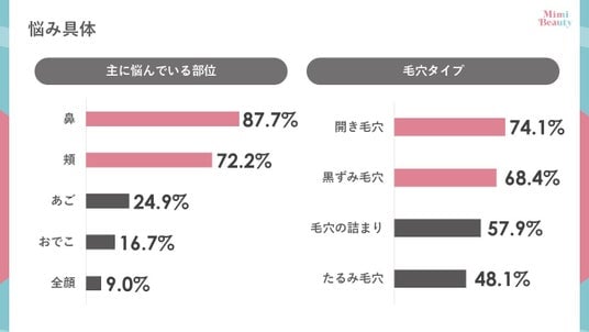 続いて、顔の毛穴で悩んでいる人に対して、悩んでいる部位について調査したところ、「鼻」が1位で87.7%、次いで頬が72.2%という回答でした。さらに、毛穴悩みのタイプについても調査したところ、「開き毛穴」が最も多く、74.1%という結果でした。その他に「黒ずみ毛穴」、「毛穴の詰まり」、「たるみ毛穴」を選ぶ人も半数近くいることから、「毛穴悩み」には、複数の部位において複数の毛穴タイプが存在し、複合的な悩みを抱えている人がいることが分かります。