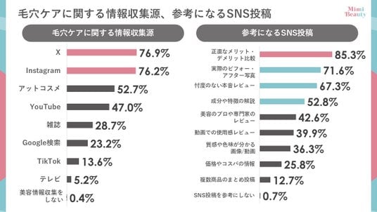 - 毛穴ケアの情報源は「X」、「Instagram」、参考になる投稿は「正直なメリット・デメリット比較」、「ビフォー・アフター」、「成分解説」
