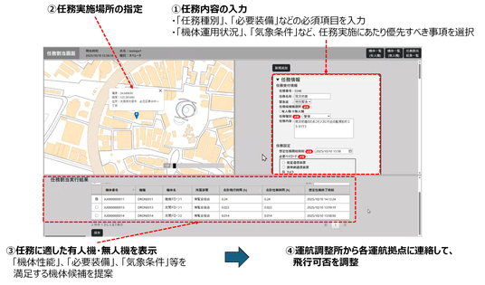- NTTデータ:無人機システム連携基盤および無人機運航データの統合管理を担当