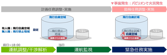 大規模イベントの警備等に際して有人機と無人機(ドローン等)が混在して活用される機会が今後増えてくることが見込まれます。これまでは、それぞれが異なるシステムで管理されているため、リアルタイムでの監視や突発的に発生した事象に迅速に対応することが困難でした。