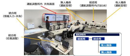 運航調整所において、飛行前日の調整、飛行当日の運航監視、飛行当日に発生した緊急任務を有人機・無人機に割り当てる対応(任務割当)等をシナリオに基づいて行いました(図1、図2)。