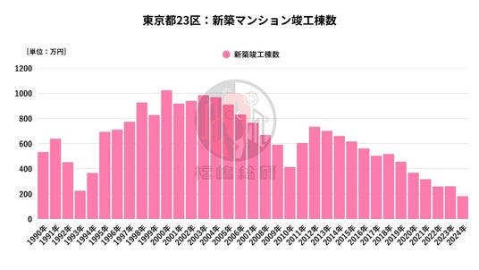 背景にあるのは、建築費と土地価格の同時高騰です。建設現場では資材の値上がりと人手不足が続き、さらに建設用地の取得コストも上昇。これにより、新築マンションの供給数自体が年々減少傾向にあります。新築物件の「竣工棟数」が右肩下がりを続ける一方で、限られた供給に対して旺盛な購入需要が集中するため、価格は下がるどころか一段と上がりやすい構造になっています。