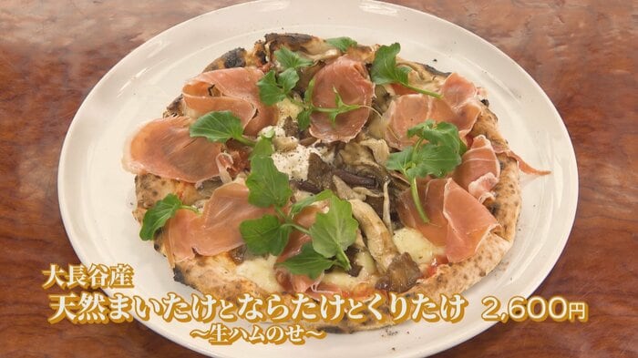 「大長谷産 天然まいたけとならたけとくりたけ生ハムのせピザ」は3種類のきのこ、それぞれの食感と香りを贅沢に楽しめる逸品だ。この味を求めて、県外からも多くの人が訪れる。