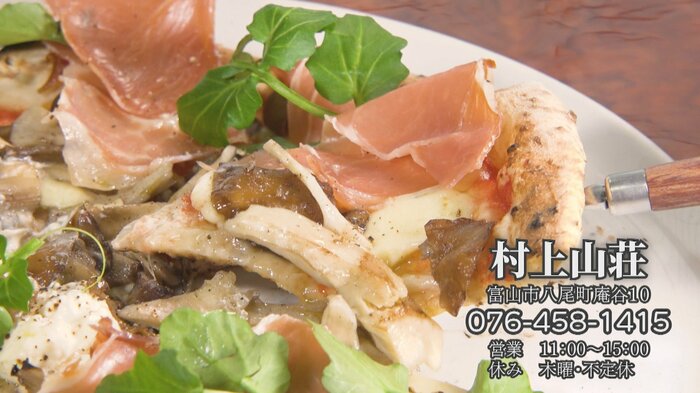「村上山荘」一番の人気メニューは「ふきのとう味噌のピザ」。また、熊肉を使った「熊のミートソース」も提供している。森恵美さんは「熊はどんぐりとか木の実とかしか食べてないから全く臭くない。脂がまたおいしい」と話す。