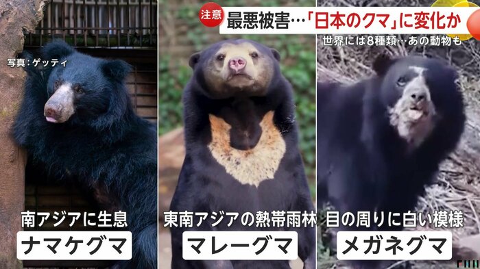 さらに、インドやスリランカなど南アジアに生息するナマケグマや東南アジアの熱帯雨林にいるマレーグマ、目の周りの白い模様が眼鏡のように見えるメガネグマがいる。