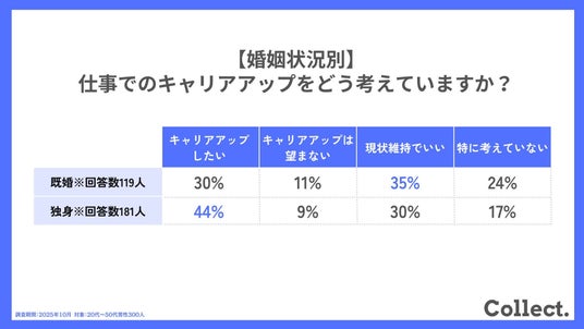 婚姻状況別に見ると、独身者は、「キャリアアップしたい」が4割以上を占め、仕事に対して積極的な意欲を持つ層が多いことが明らかになりました。一方、既婚者では「現状維持でいい」(35%)が最多となりました。