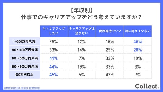 - 年収別では年収増に応じてキャリアアップ志向が顕著。同時に現状維持志向も強まる