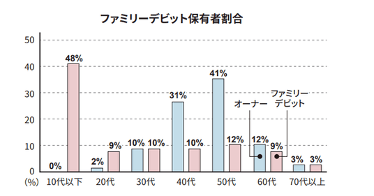 ファミリーデビットカードの保有者割合を見ると、オーナーとなっているかたは40~ 50代が多く、ファミリーデビットカードの保有者は10代以下が48%と、お子さんと資産を共有し、お小遣い管理やお金の管理を学習する用途などでご利用しているかたが多いことがうかがえます。