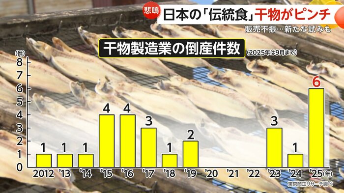 東京商工リサーチによると、干物や塩漬けを製造する企業の倒産は2023年は3件、2024年は1件だったが、2025年は9月までですでに6件に達している。