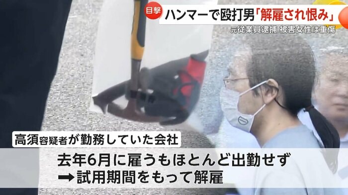 イット! 「1カ月で解雇され会社に恨み」元勤務先で女性従業員の頭部をハンマーで殴打…32歳の男逮捕 女性は全治3カ月の重傷 イット! 2025年11月10日 月曜 午前11:30 「1カ月で解雇され恨み持った」と供述 なぜ、元勤務先で犯行に及んだのか。 調べに対し、高須容疑者は「突然1カ月で解雇され、会社に恨みを持った」と供述している。 高須容疑者が勤務していた会社によると2024年6月に雇ったものの、ほとんど出勤することがなく、試用期間をもって解雇に至ったという。 警視庁は詳しい経緯を調べている。 (「イット!」11月7日放送より) この記事に載せきれなかった画像を一覧でご覧いただけます。 ギャラリーページはこちら(11枚) 1 2 3 【よく一緒に読まれている記事】 「ほとんど出勤せず…1カ月で解雇」逆恨みで元勤務先に侵入のハンマー男逮捕 頭部殴られた女性従業員は全治3カ月 イット!の他の記事 「まじかぁー…」新東名で“燃える脱輪タイヤ”急接近…乗客38人乗せた夜行バス間一髪で回避 「あ然」夜道で信号無視する危険な車も 社会 2025年11月10日 「今年のクマかなり危険」“凶暴クマ”鉄檻かみつき大暴れ…旅館に“居座り”も 死亡者数過去最多13人 「クマよけ鈴」生産追いつかず 社会 2025年11月10日 「死んだと思った」“紙一重”と“神回避”の瞬間 歩行者の目の前に屋根板落下 暴走車を“奇跡のジャンプ”で避けた男性 トルコ 国際 2025年11月9日 店員も“尻もち”…カフェの「ガラス張りのドア」に激突する人続出 目印設置も「まだぶつかるんです」 トルコ 国際 2025年11月9日 一覧ページへ